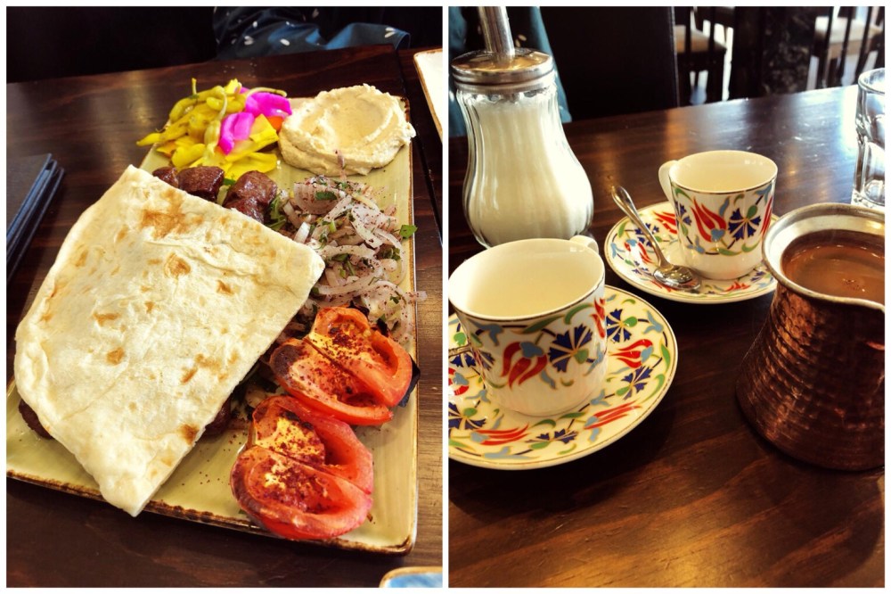 Kami pergi kesuatu area dimana disana-sini terlihat banyak orang Islamnya. Alangkah beruntungnya mereka karena banyak sekali restauran atau cafe yang halal. Pilihan kami jatuh pada restaurant Iraq yang kelihatan bersih dengan kapasitas pengunjung yang lumayan. Di jendela kaca diluar terpampang menu-menu yang tersedia beserta harganya. Mmmm … harganya lumayan murah. Dan menunya tidak banyak beda dengan restoran-restoran Arab lain:daging, ayam, menu sarapan tradisi, dip, roti, dan salad … hanya kelihatan lamb-nya tidak begitu banyak lemak. Salad mereka ada butiran-butiran buah delima yang aku suka juga ‘pink pickle’ kesukaanku. Aku suka musik Arab yang mereka mainkan kebetulan lagunya yang sering ayahku dengar di Indonesia. Ketika kami mampir kerumah makan ini tidak waktu lunch juga belum waktu dinner ditambah weekday. Tapi pengunjungnya lumayan cukup banyak. Cuma kelihatan lebih banyak yang take away. Jadi rupanya kita bisa pesan dan mengambilnya sendiri untuk dibawa pulang. Pelayannya cukup ramah, decorasi ruangan biasa saja. Makanan yang kami pesan lamb dan salad karena kami tidak begitu lapar. Porsinya cukup banyak buat ukuran kita. Kami juga mencoba kopi Iraq yang kental dan sedikit berbumbu.