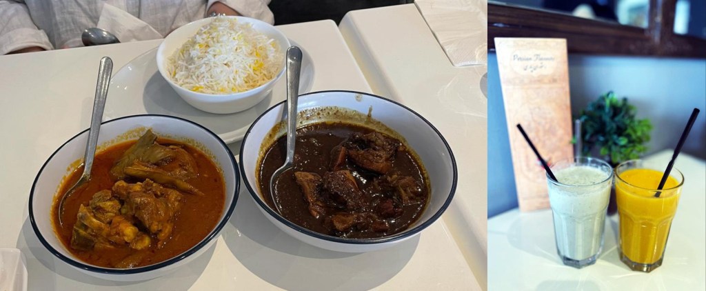 Kami belum pernah mencoba makanan Persia; kebetulan sekali ada restaurant halal Persia yang tidak jauh dari dimana aku tinggal. Dari luar terlihat seperti dua toko yang terpisah, ternyata mereka membagi dua ruangan terpisah – satu untuk “groceries” dan take-away dan yang satu lagi khusus makan disana. Saat kami masuk sudah disambut dengan senyum dan Assalammualaikum, membuat kami yakin restaurant ini benar halal. Cuma ada satu pelayan disana, kelihatan dia agak repot untuk membersihkan beberapa meja yang masih terlihat banyak piring-piring bekas kostumer. Pelayanan ramah dan standard saja tidak cepat tidak pula lambat. Untuk pembuka kami memilih bamyanie perkie yang mirip dengan sambosa dan sup ayam yang lumayan enak untuk udara dingin dari musim rontok di Melbourne. Makanan utama kami memilih fesenjan (nasi dan ayam yang terasa hampir sama dengan rasa semur cuma ada rasa asamnya sedikit) dan khoresh bademjan (kambing dengan rasa tomat). Doogh – minuman yoghurt yang enak – mengakhiri makan siang kami hari ini.