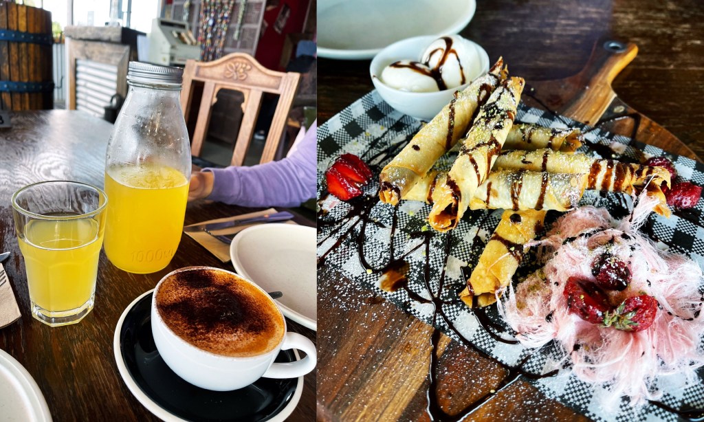 I’m really a fan of Turkish food especially the bread. The taste is so different from bread. Tried it for the first time when our kids were little – at the time a Turkish restaurant was a regular customer of our old halal butcher shop in Hampton near Brighton. This time we returned to DeJa Wu restaurant, for my Youtube. Because it was between breakfast and lunch, the brunch menu was being served. Service is still friendly and polite. And the place is popular. So it’s a bit of a wait for the order to arrive. We chose pineapple juice, and menemen (Turkey baked egg), sweet treats and cappuccinos.